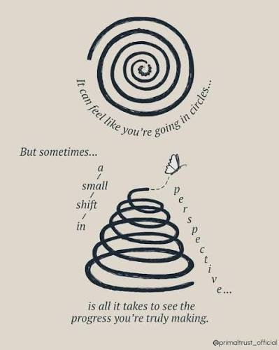 Circles are when we do the same exact actions that bring us to the same exact results. In your journey you will experience things that are reminiscent of the past. In those moments when you can feel the nostalgia creeping in remind yourself as long as you do not chose the same actions or thoughts from the past you won’t create the circle. Even with temptation if you chose something different (we can worry about right or wrong afterwards) then you instead create a spiral. Your Spiral is your olive branch to level up even though it seems similar to your circle when looked at in 1D there is still progress being made through elevation. Cut yourself some slack, tension is just as embedded into growth as attention and movement. When we are faced with this in our pursuit of healing remind yourself this phase is also progressive and to make progress is not exclusive to feeling no strain or solely moving “forward”. Okay! I’m leaving it here for this week! As always comments are encouraged in Thee Gathering!